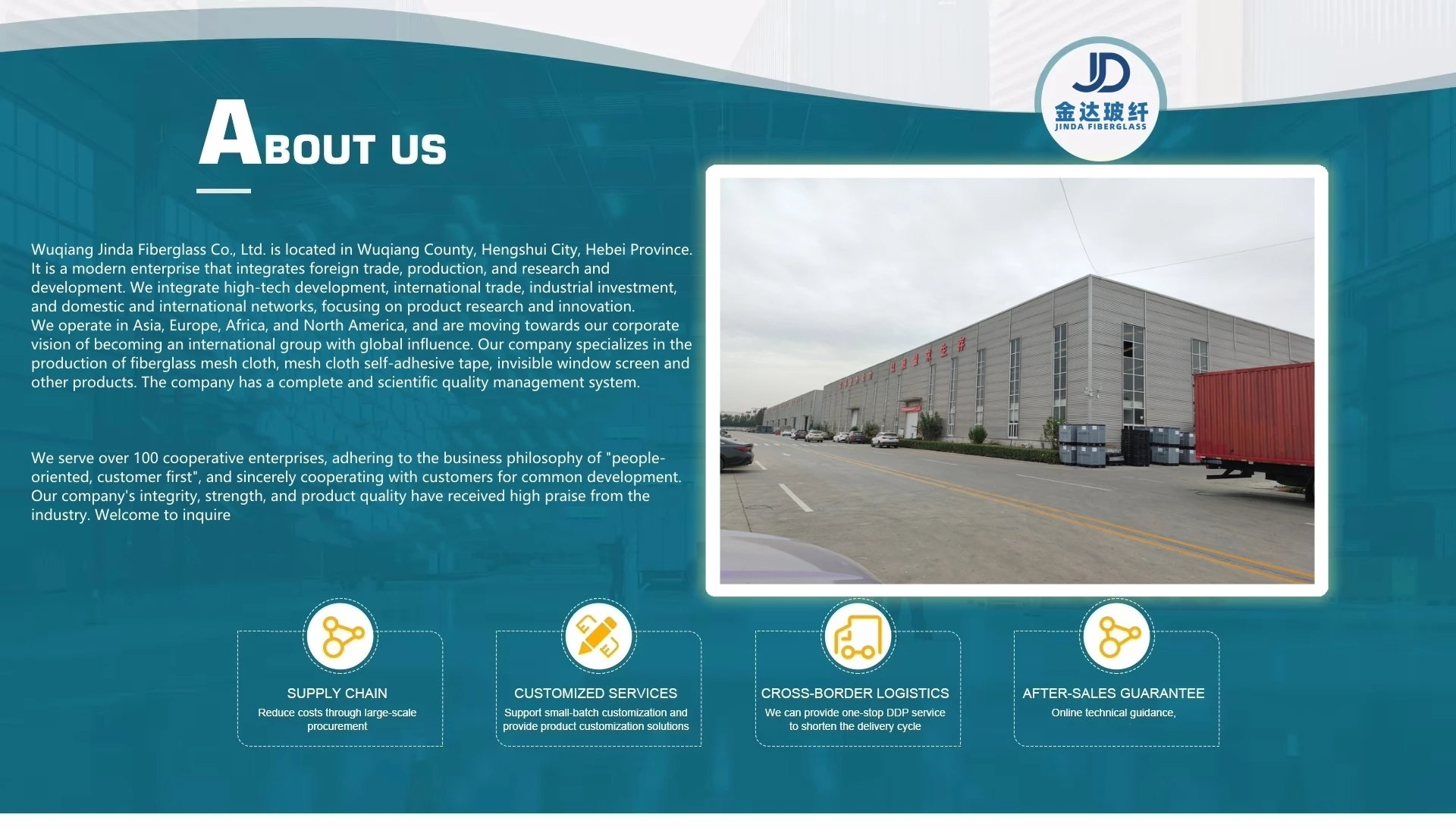 Wuqiang Jinda Fiberglass Co., Ltd. Productos principales:Malla de fibra de vidrio, cinta de malla autoadhesiva de fibra de vidrio para construcción de paredes, pantalla de ventana de insectos de fibra de vidrio, malla de fibra de vidrio resistente a los álcalis, cinta de malla de fibra de vidrio